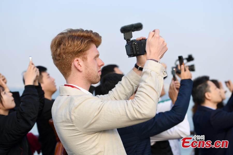 People take photos during the demonstration flight between Shenzhen and Zhuhai at Shekou Cruise Home port in Shenzhen, south China's Guangdong Province, Feb. 27, 2024. (Photo: China News Service/Chen Wen)