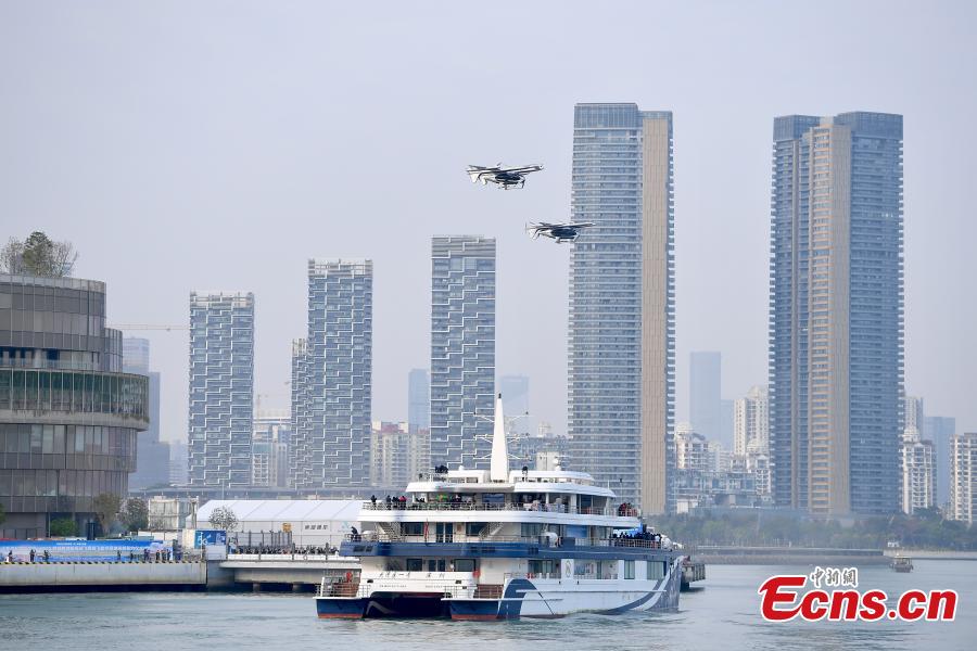 Two 5-seat eVTOL (electric vertical takeoff and landing) aircraft perform demonstration flight between Shenzhen and Zhuhai at Shekou Cruise Home port in Shenzhen, south China's Guangdong Province, Feb. 27, 2024. (Photo: China News Service/Chen Wen)