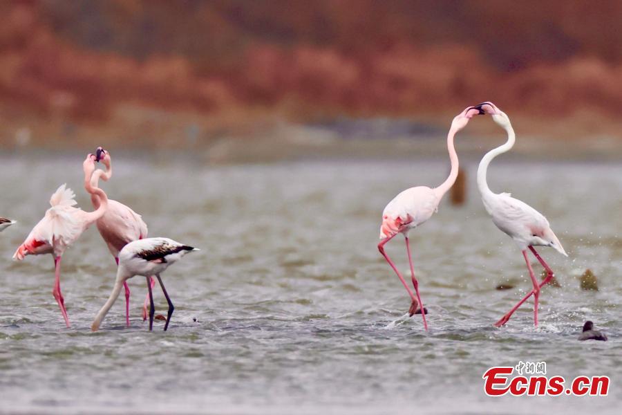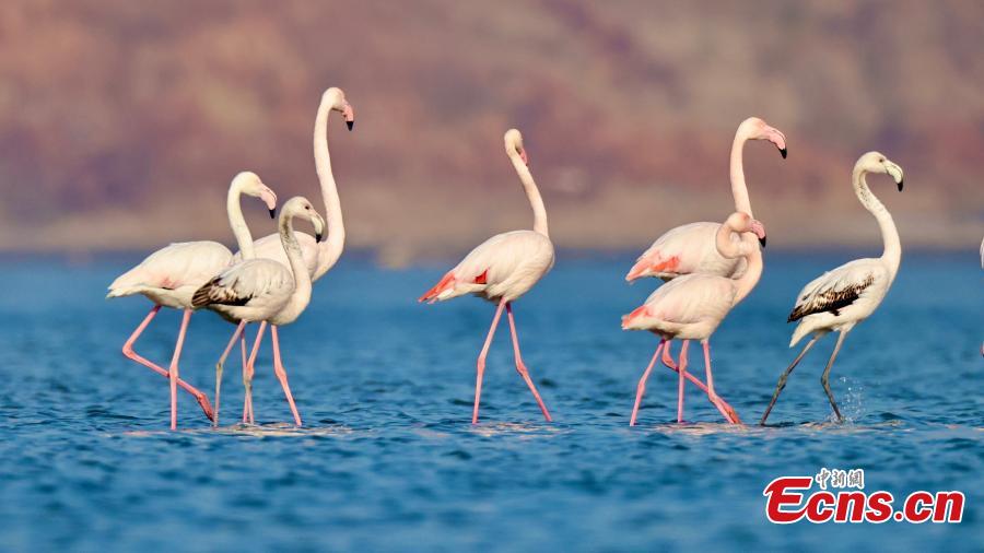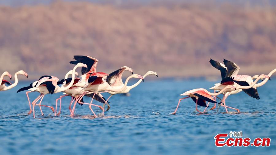 Flamingos wade through the water at the Tiaozini wetland, a UNESCO World Natural Heritage site, in Yancheng City, east China's Jiangsu Province. They are ready for spring migration. (Photo: China News Service/Li Dongming)
