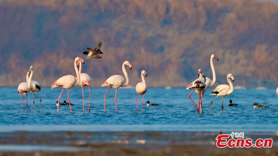 Flamingos were first spotted at the Tiaozini Wetland in 2015. By the end of 2023, the number of migrated flamingos had been recorded for nine consecutive years, which rose from one to 14.