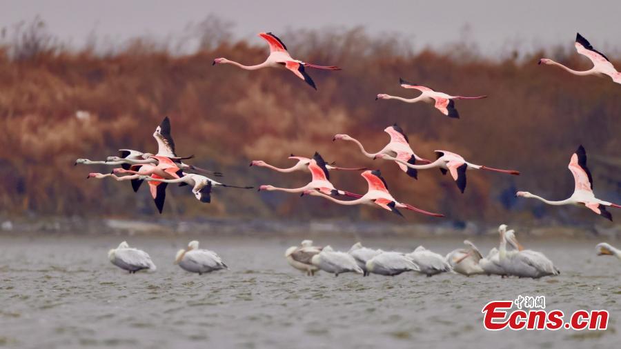 Flamingos fly over the Tiaozini Wetland, a UNESCO World Natural Heritage site, in Yancheng City, east China's Jiangsu Province. They are ready for spring migration. (Photo: China News Service/Li Dongming)