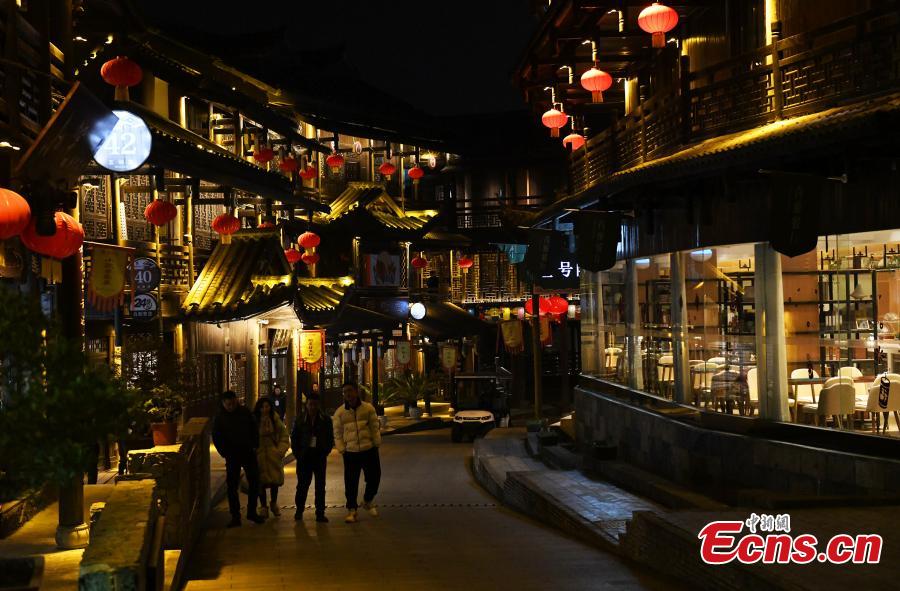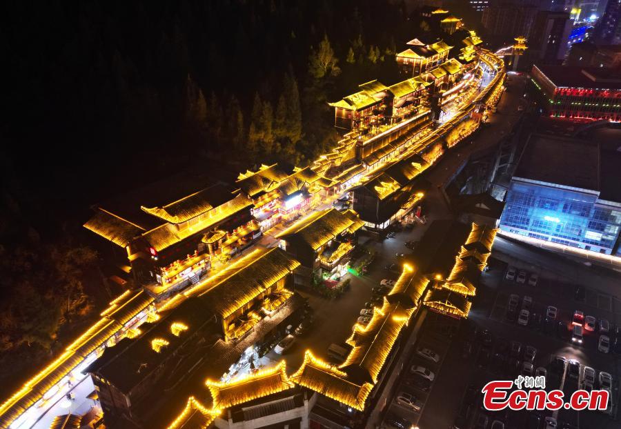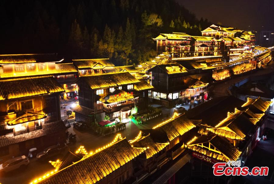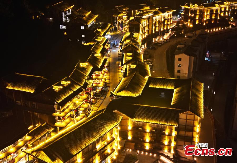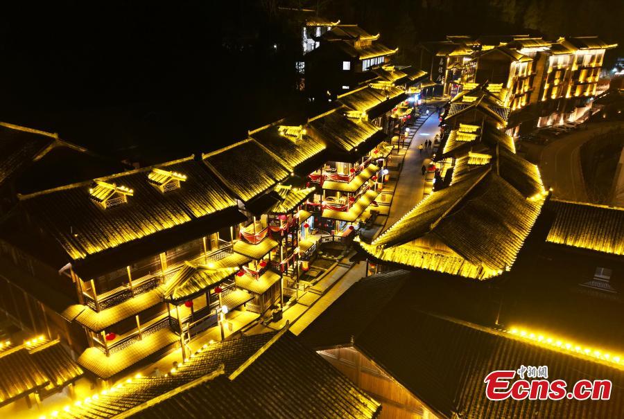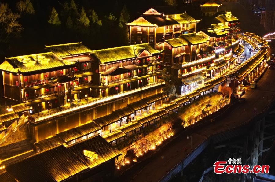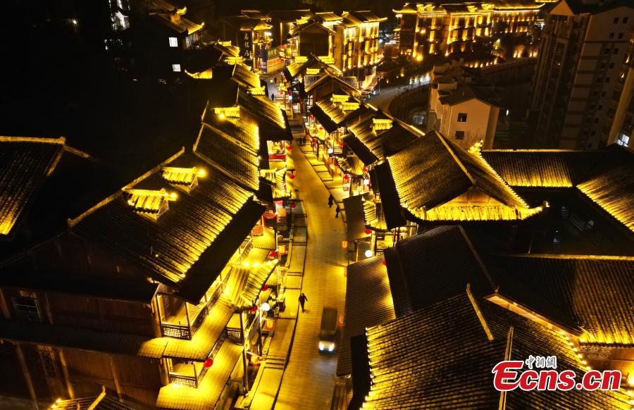 Youzhou ancient town is lit up at night, creating a dream-like scenery in Youyang Tujia and Miao Autonomous County, Chongqing , Feb. 29, 2024. (Photo: China News Service/Zhou Yi)