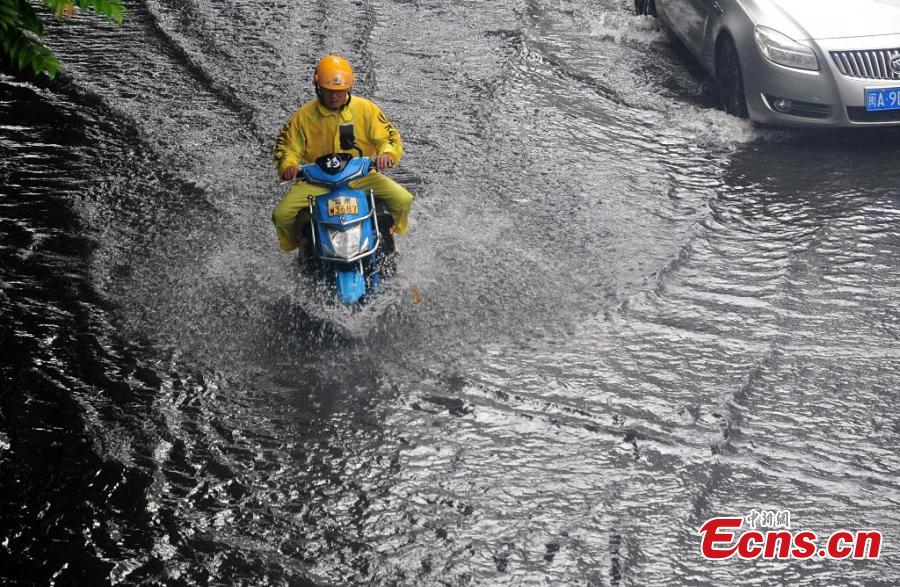 A resident rides through a waterlogged road in Fuzhou, East China's Fujian Province, June 16, 2024. (Photo: China News Service/Zhang Bin)