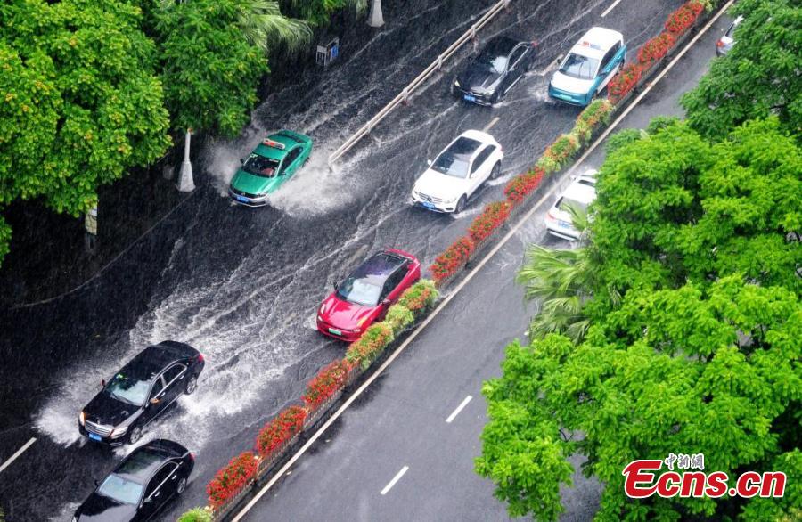 Vehicles pass through a waterlogged road in Fuzhou, East China's Fujian Province, June 16, 2024. (Photo: China News Service/Zhang Bin)