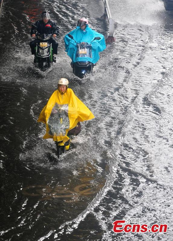 Residents ride through a waterlogged road in Fuzhou, Fujian Province, June 16, 2024. (Photo: China News Service/Zhang Bin)