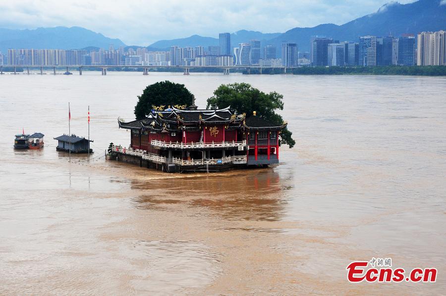 This photo taken on June 16, 2024 shows the Jinshan Temple is surrounded by the rising floodwaters, becoming an "isolated temple" in Fuzhou, Fujian Province. (Photo: China News Service)