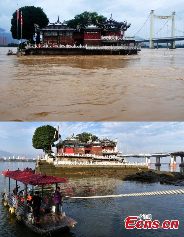 This combo photo shows a constrast of the Jinshan Temple after (above) and before (below) the flood in Fuzhou, Fujian Province. (Photo: China News Service)