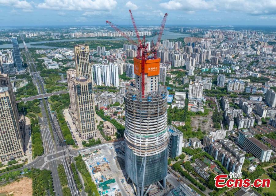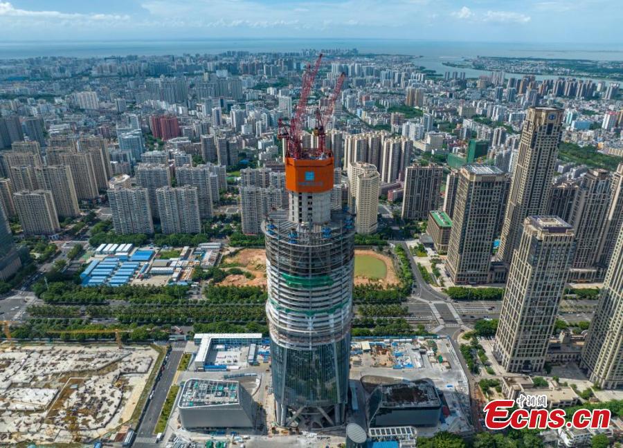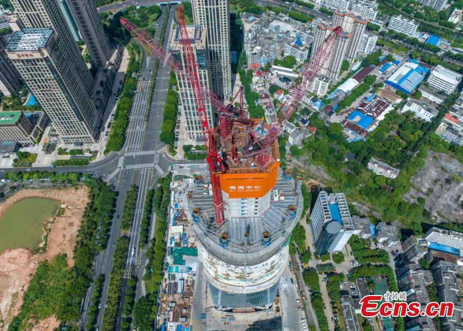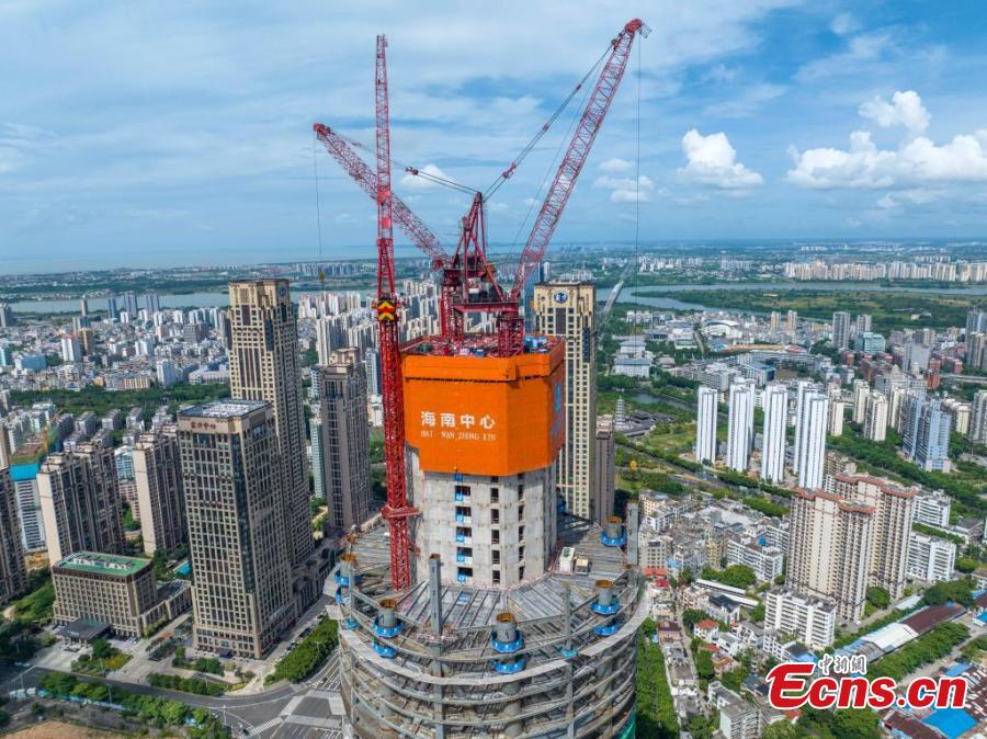 The picture shows the Hainan Center project under construction in Haikou City, on June 25, 2024.(Drone photo: China News Service / Luo Yunfei)