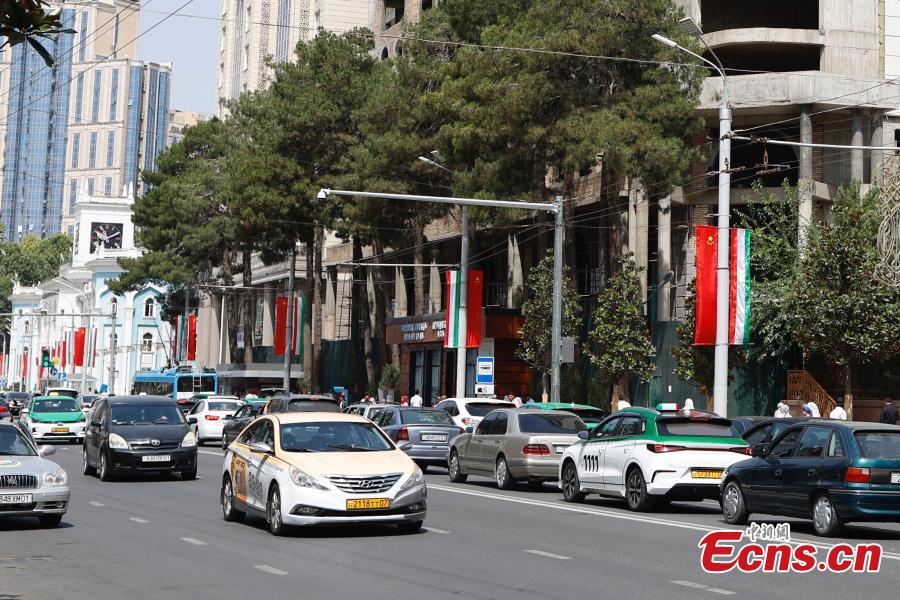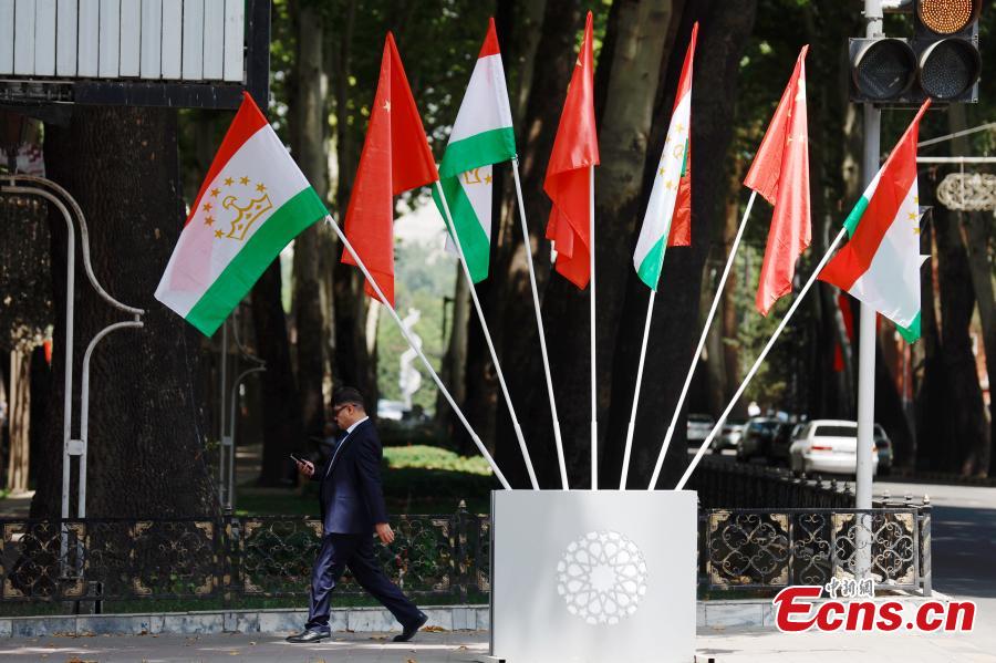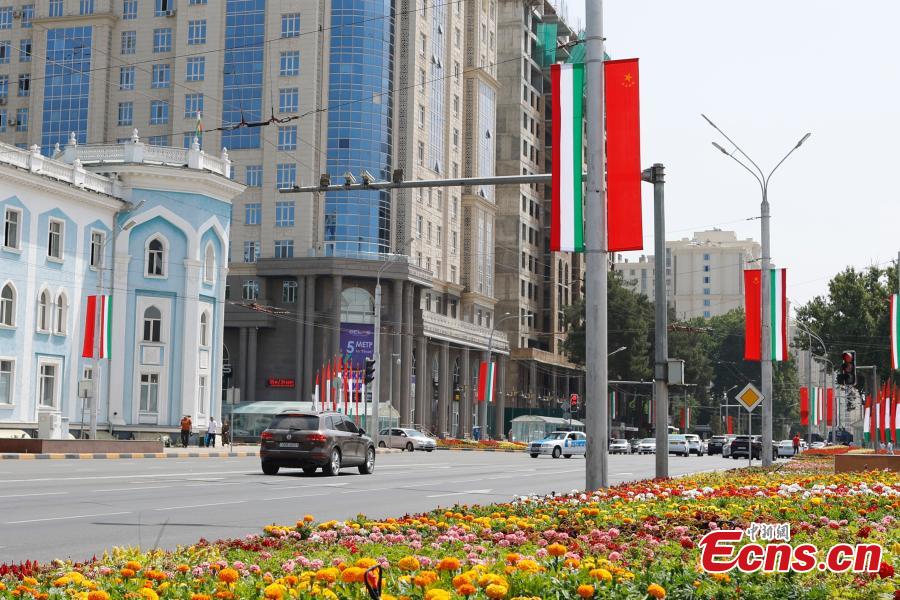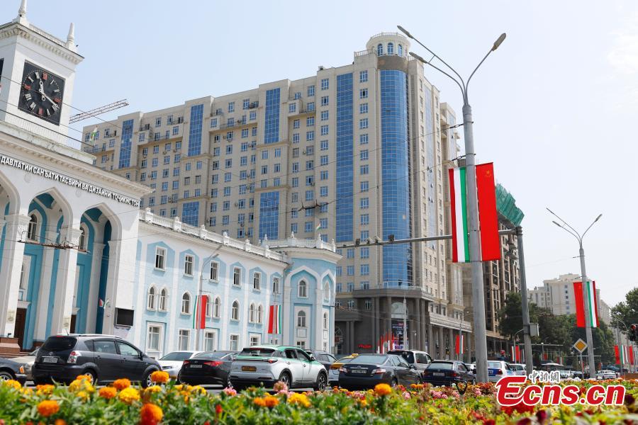 Flags of China and Tajikistan are seen in Dushanbe, capital of Tajikistan, on July 4, 2024, to welcome the visit of Chinese President Xi Jinping.(Photo: China News Service / Han Haidan)