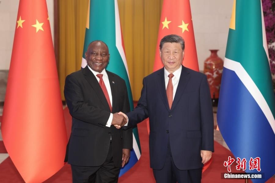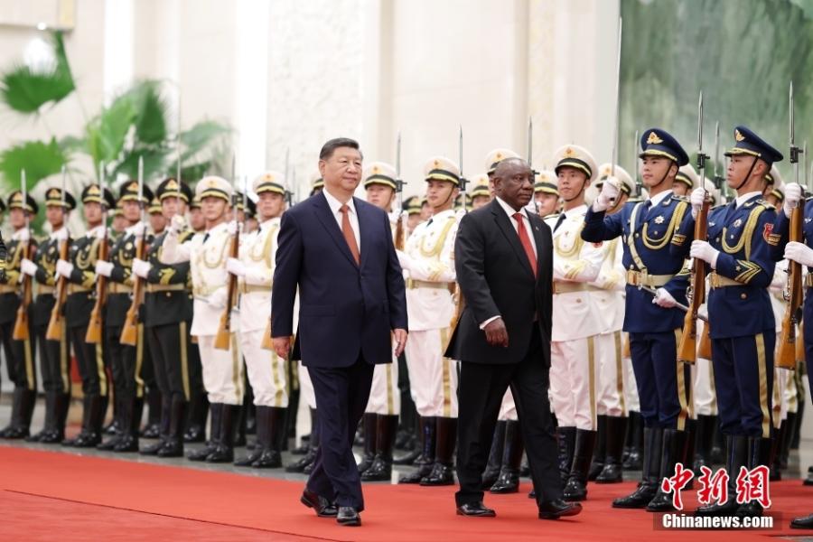 Chinese President Xi Jinping holds a welcoming ceremony for South African President Cyril Ramaphosa, who is in Beijing for the 2024 Summit of the Forum on China-Africa Cooperation (FOCAC) and a state visit, in the Northern Hall of the Great Hall of the People prior to their meeting in Beijing, capital of China, Sept. 2, 2024. Xi held talks with Ramaphosa at the Great Hall of the People in Beijing on Monday. (Photo/China News Service/Sheng Jiapeng)