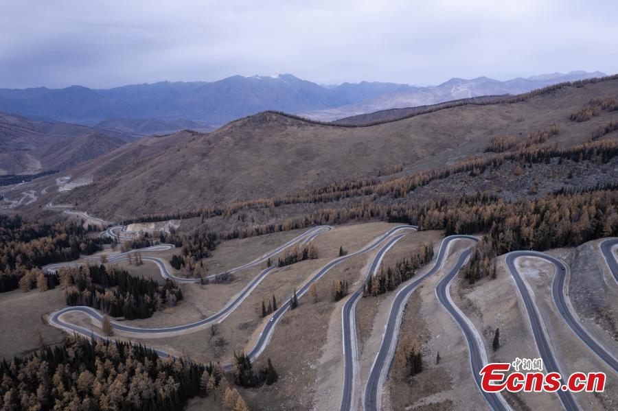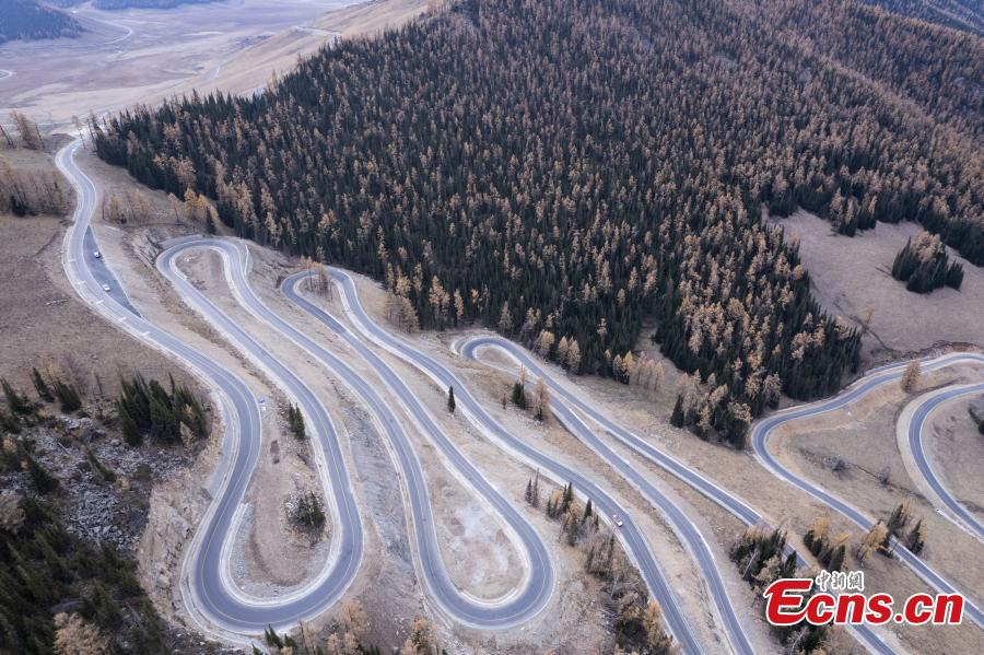 Aerial view of the zig-zag road linking Altay City and the Kanas scenic area in Hemu Village road in Altay Prefecture of northwest China's Xinjiang Uyghur Autonomous Region, Oct. 7, 2024. (Photo/VCG)