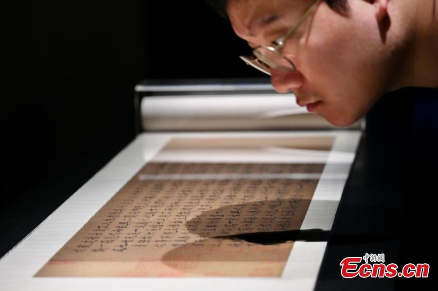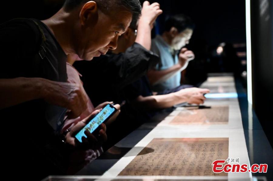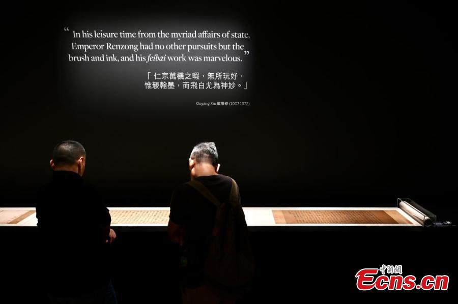 Visitors view the Preface to the Poems Composed at the Orchid Pavilion after Wang Xizhi, which was copied by the Song Emperors Renzong and Gaozong, at the Sotheby's in the Hong Kong Special Administrative Region, Oct. 8, 2024. (Photo: China News Service/Li Zhihua)