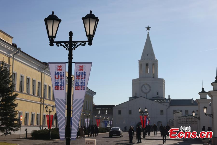 Photo taken on Oct. 20, 2024 shows banners hanging on the street in Kazan, Russia. The 16th BRICS Summit will be held in Kazan from October 22 to 24, 2024. (Photo: China News Service/Sheng Jiapeng)
