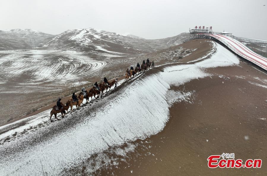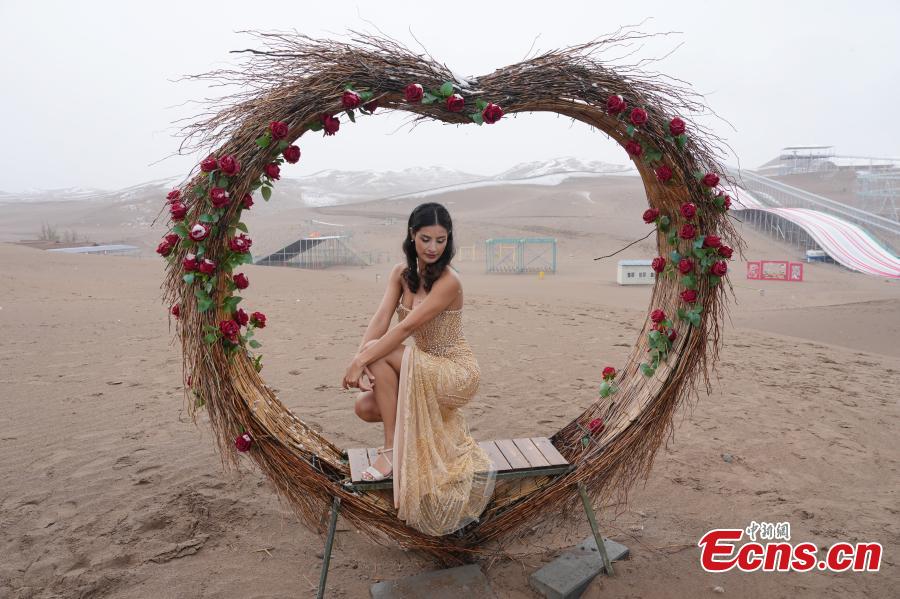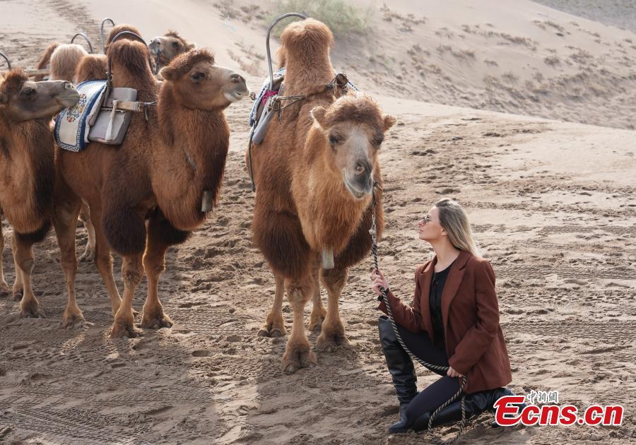 Contestants from the globe went to the Sun Island Tourism Scenic Spot to take photos with the desert and camels on Tuesday. Gliding, orienteering, camel racing and other activities in desert have attracted a lot of tourists to the scenic spot.