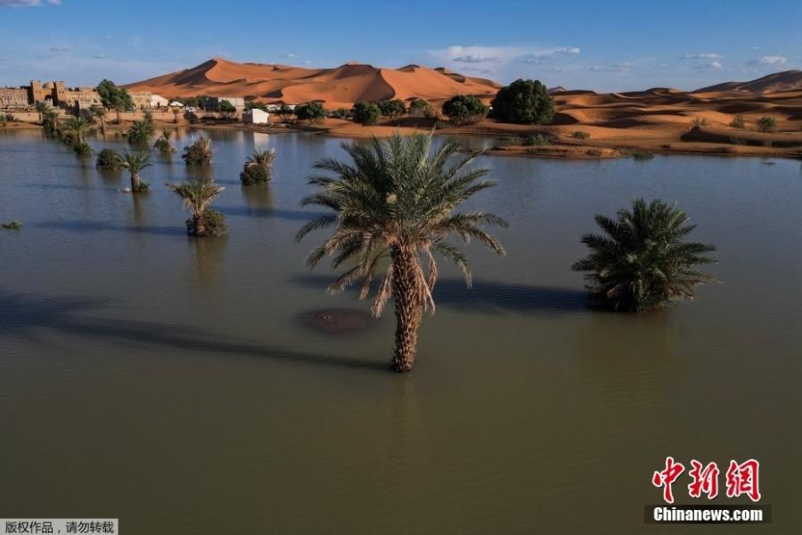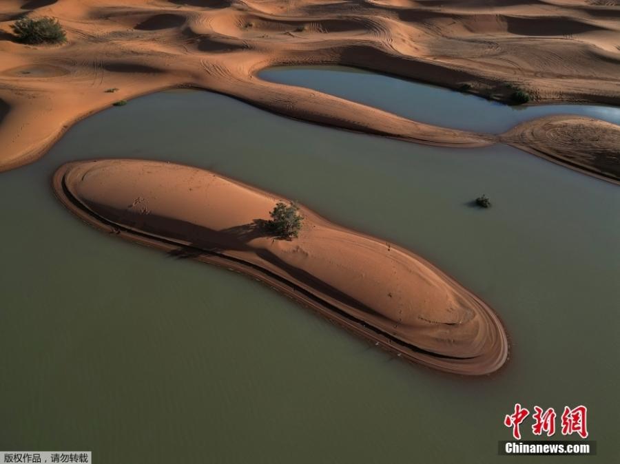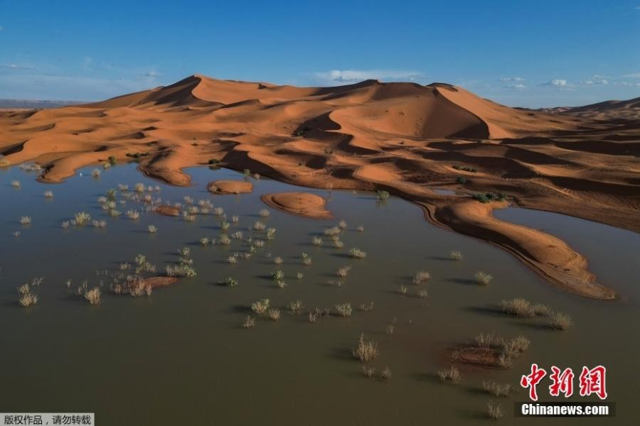 A drone view shows sand dunes partially covered by floodwaters after rare rainfall hit the area in September, in Merzouga, Morocco, Oct. 24, 2024. (Photo/Agencies)