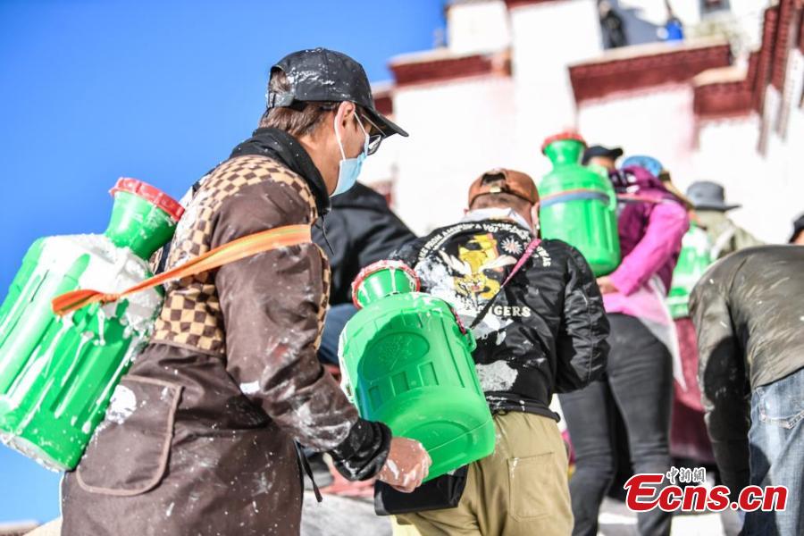 Workers carry paint at the Potala Palace during an annual renovation of the ancient architectural complex in Lhasa, southwest China's Xizang Autonomous Region, Oct. 28, 2024. (Photo/China News Service)