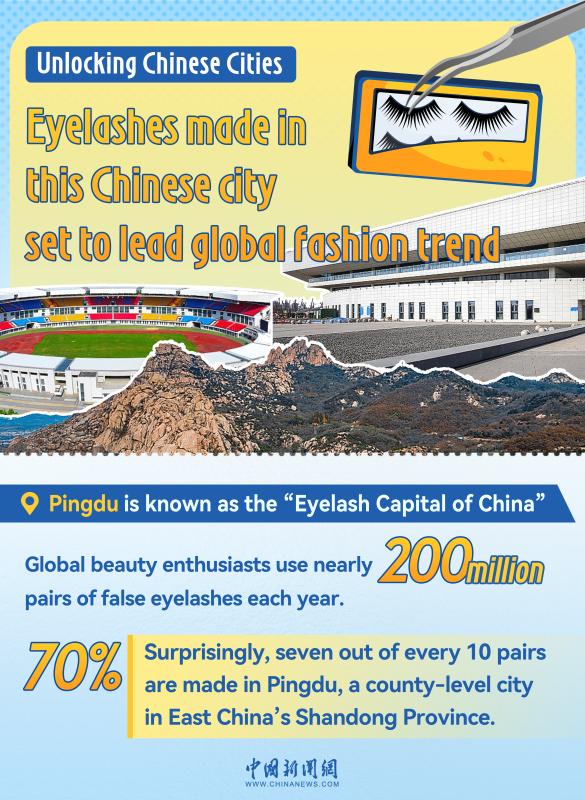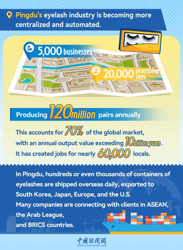 A single false eyelash not only enhances a wearer's charm, but also helps boost the beauty industry in Pingdu, Shandong Province. China leads the world in eyelash production, with Pingdu at the forefront. A daily average of over 300,000 pairs of false eyelashes are shipped overseas from this city, especially popular in Japan, South Korea, Europe, and the U.S., adding a touch of Chinese charm to global beauty trends.