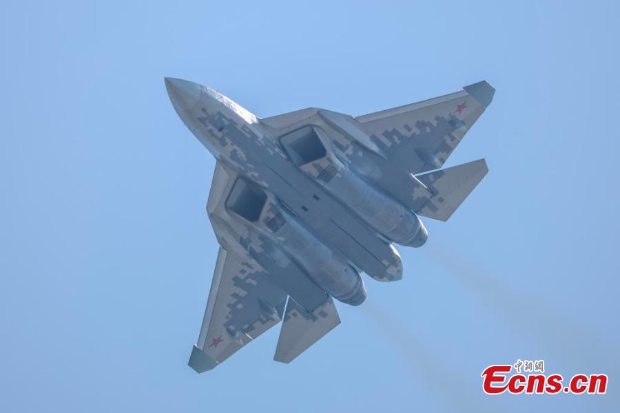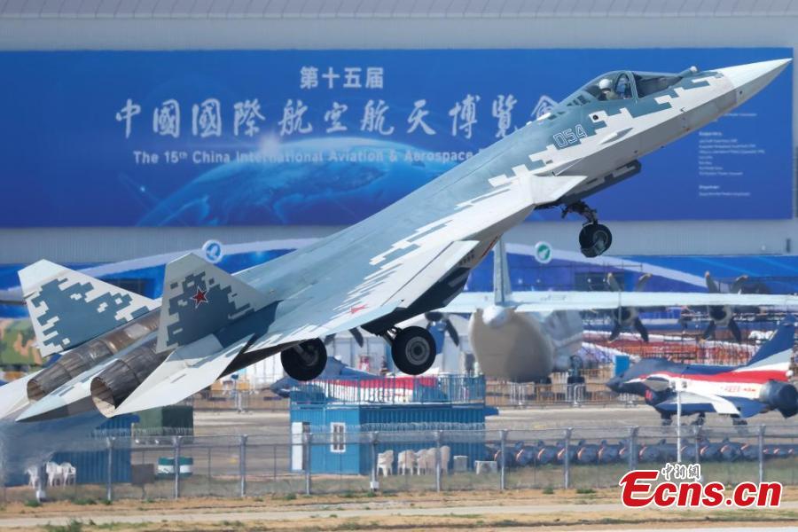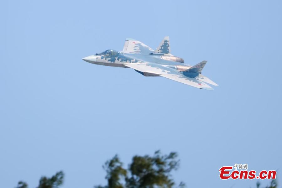 A Russian Sukhoi Su-57 stealth fighter jet conducts test flight ahead of the 15th Airshow China at the Zhuhai International Air Show Center, south China's Guangdong Province, Nov. 7, 2024. (Photo: China News Service/Chen Jimin)