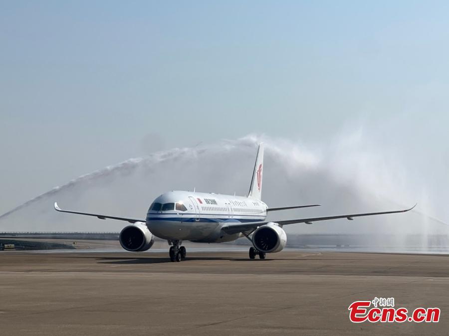 China's homegrown C919 aircraft passes through a water gate at Macao International Airport in the Macao Special Administrative Region, Nov. 7, 2024. (Photo: China News Service/Zheng Jiawei)
