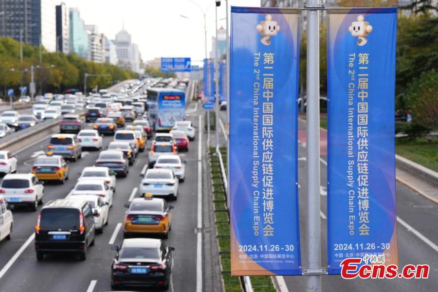 Posters promoting the 2nd China International Supply Chain Expo are hung along the second ring load in Beijing, Nov. 25, 2024. (Photo: China News Service/Zhao Wenyu)