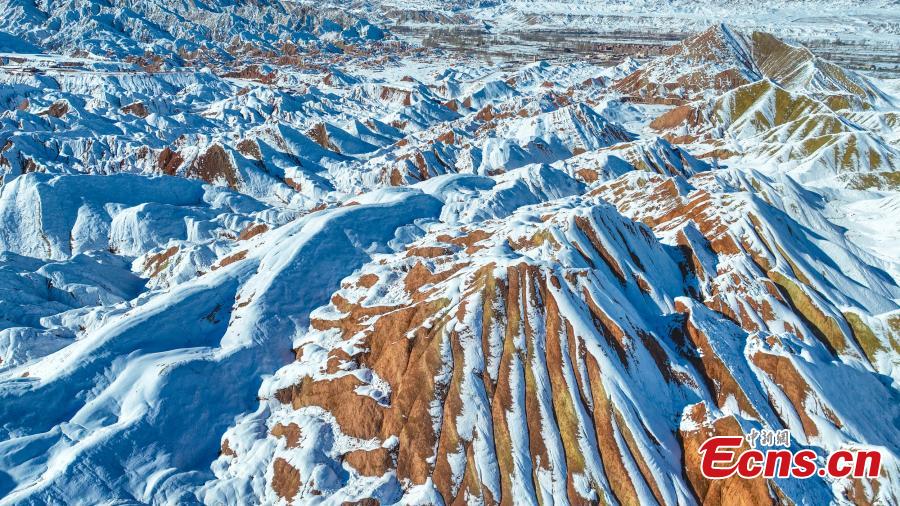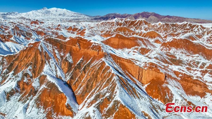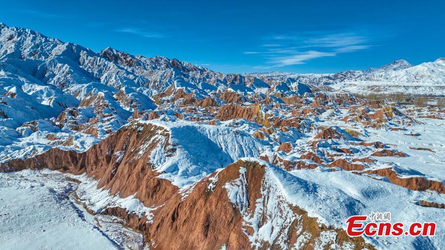 Snowfall showcases distinct layers on the gorgeous rock formations of the Danxia landform, characterized by reddish sandstone features, at Zhangye Danxia National Geological Park in Zhangye, northwest China's Gansu Province, Nov. 25, 2024. (Photo/VCG)