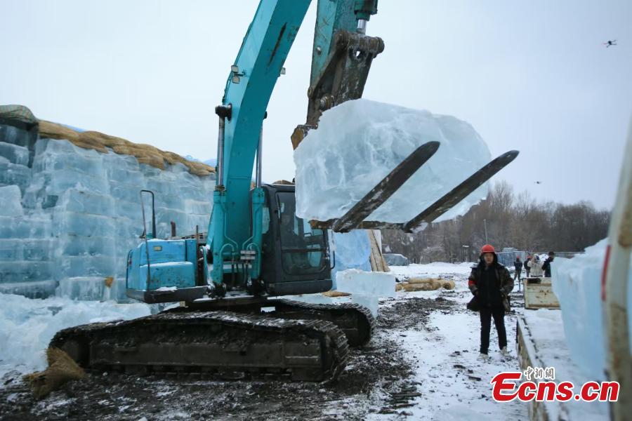 A machine removes ice cubes ahead of the construction of the 26th Harbin Ice-Snow World in Harbin, northeast China's Heilongjiang Province, Nov. 26, 2024. (Photo: China News Service/Yu Kun)