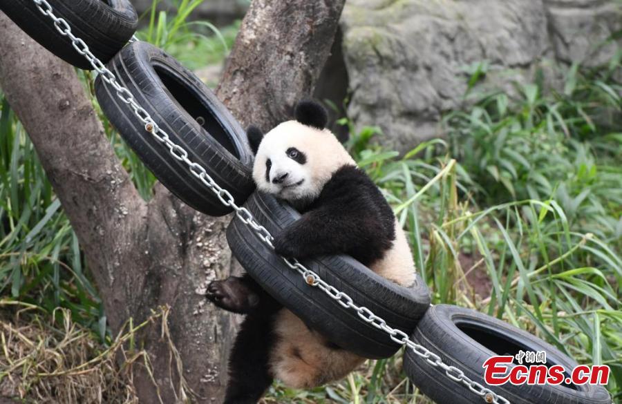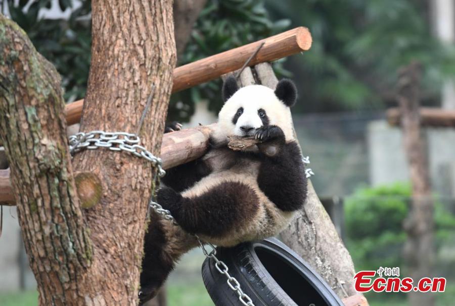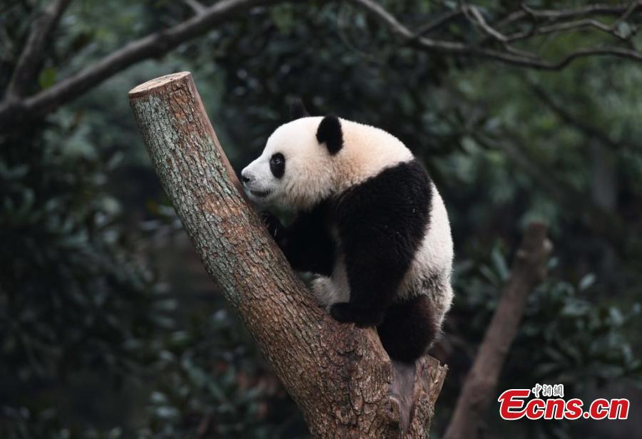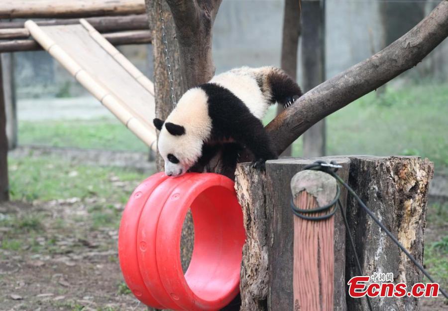 Giant panda Mang Cancan plays outdoor at Chongqing Zoo, Dec. 1, 2024. (Photo: China News Service/Zhou Yi)