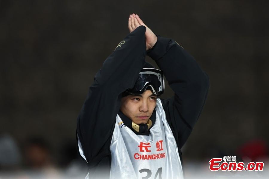 China's freestyle snowboarder Yang Wenlong celebrates during the men's snowboard final at the 2024-2025 FIS Snowboard & Freeski Big Air World Cup at the Shougang Park in Beijing, Dec. 1, 2024. (Photo: China News Service/Fu Tian)