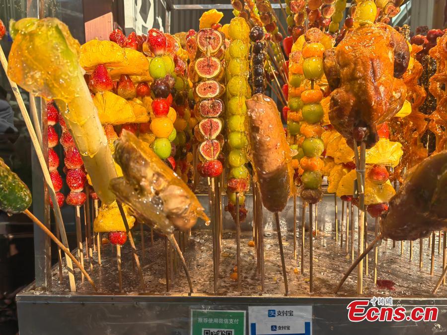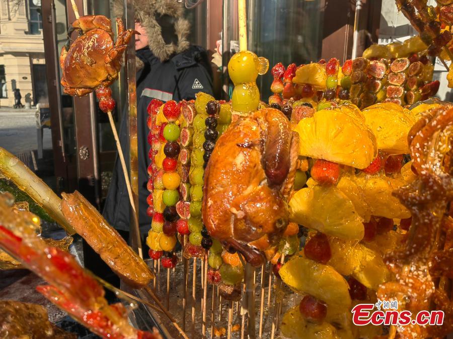 Creative Tanghulu, a traditional Chinese snack of candied fruit, becomes a hit on Central Avenue in Harbin, northeast China's Heilongjiang Province. (Photo/ICphoto)