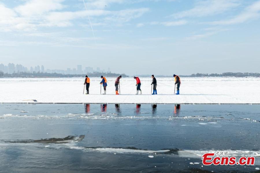 Workers collect ice from the Songhua River in Harbin, northeast China's Heilongjiang Province, Dec. 9, 2024. (Photo: China News Service/Yu Kun)