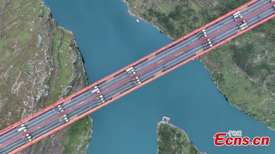 Trucks conduct a static load test on the Zangke River Bridge in southwest China's Guizhou Province, Dec. 11, 2024. (Photo provided to China News Service)
