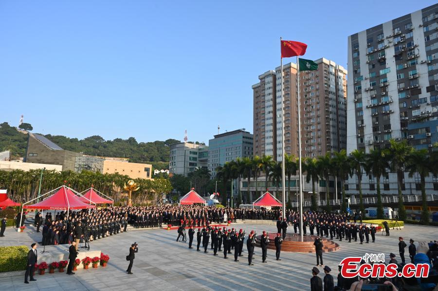 A flag-raising ceremony marking the 25th anniversary of Macao's return to the motherland is held at the Golden Lotus Square in the Macao Special Administrative Region, Dec. 19, 2024. (Photo: China News Service/Li Zhihua)
