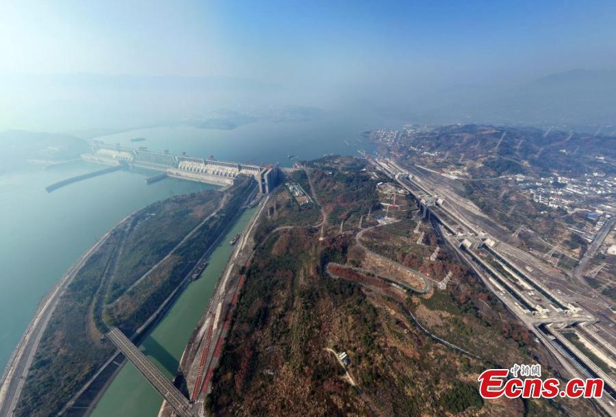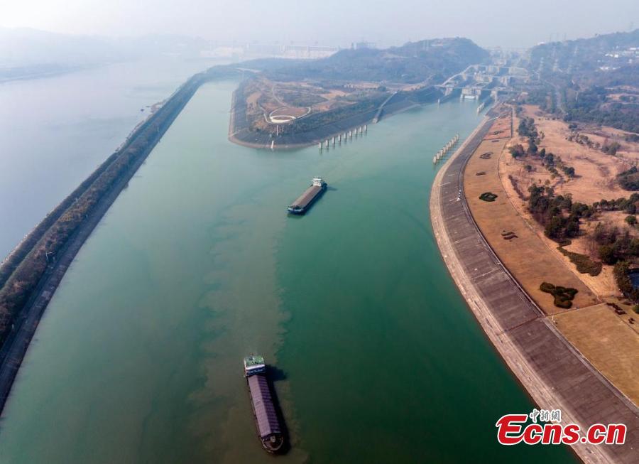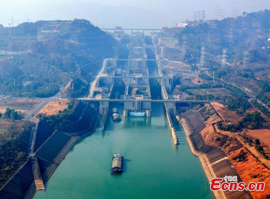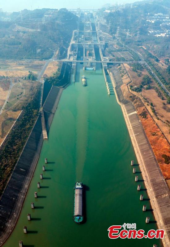 Cargo ships pass through the five-tier ship locks of the Three Gorges Dam in Yichang, central China's Hubei Province. (Photo: China News Service/Wang Gang)