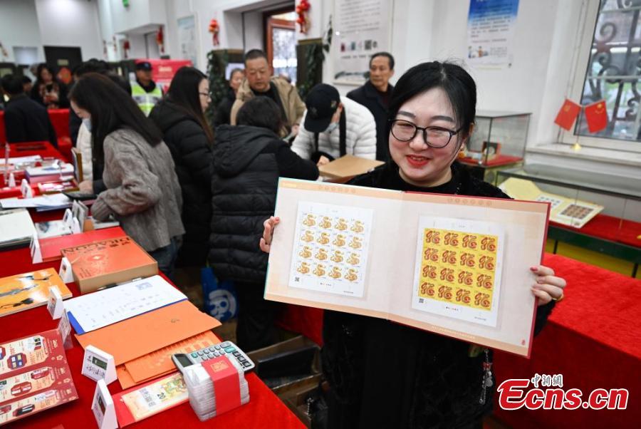 A staff member displays the special stamps marking the Chinese zodiac Year of the Snakeat a post office in Hangzhou, east China's Zhejiang Province, Jan. 5, 2024. (Photo: China News Service/Wang Gang)