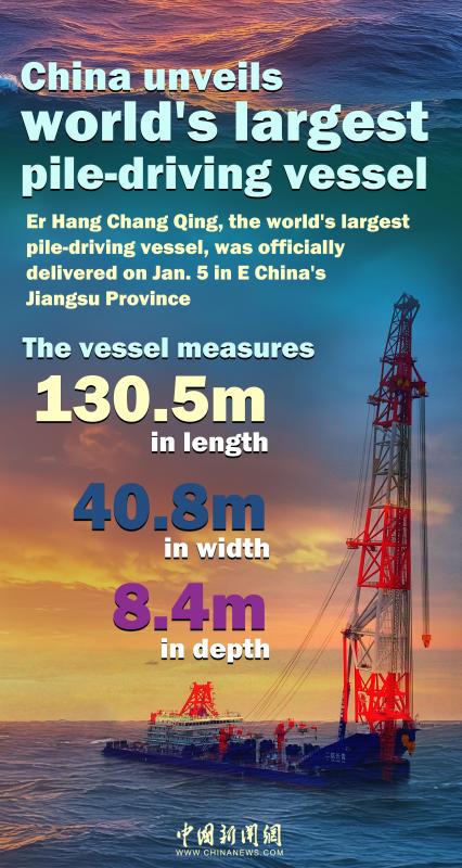 China's shipbuilding industry marked a milestone on Sunday as the world's largest pile-driving barge, Erhang Changqing, was delivered in Qidong, East China's Jiangsu Province.