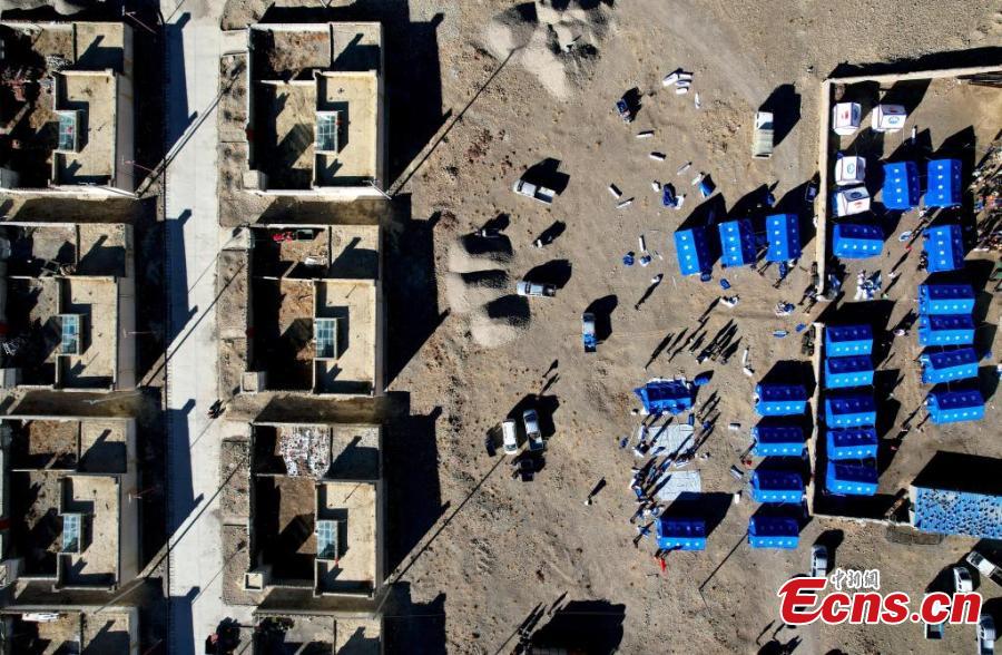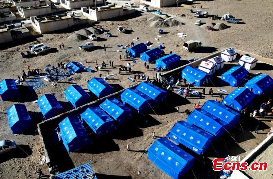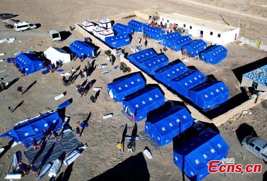 Rescuers assemble tents for earthquake-affected residents in Dingri County, Xigaze, southwest China's Xizang Autonomous Region, Jan. 8, 2025. (Photo: China News Service/Li Lin)