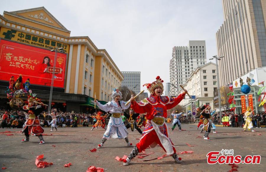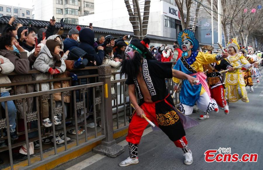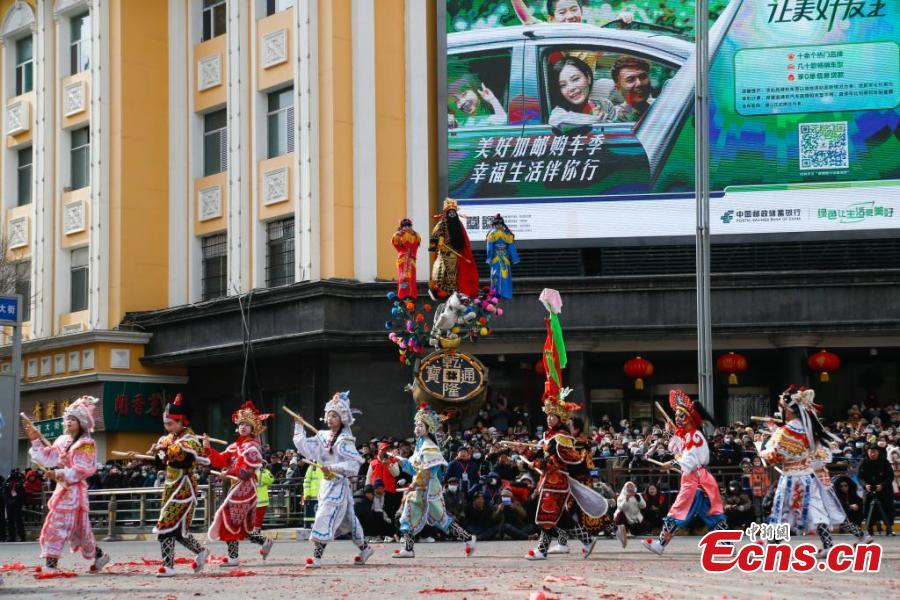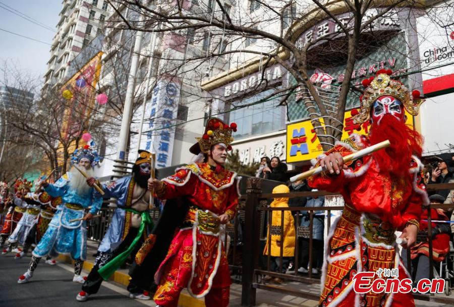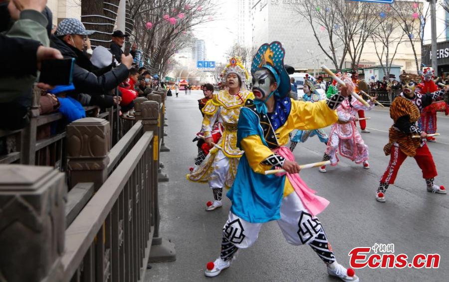 Dancers perform the Chaoshan Yingge dance, or "dance to the hero's song," in Xining,northwest China's Qinghai Province. (Photo: China News Service/Ma Mingyan)