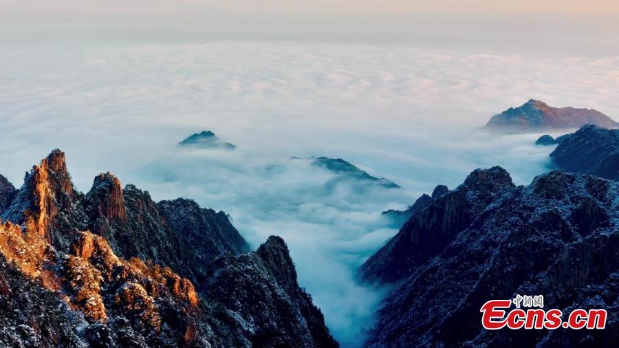 Landscape of snow-covered Huangshan Mountain surrounded by a sea of clouds in east China's Anhui Province, Dec. 8, 2024. (Photo provided to China News Service)