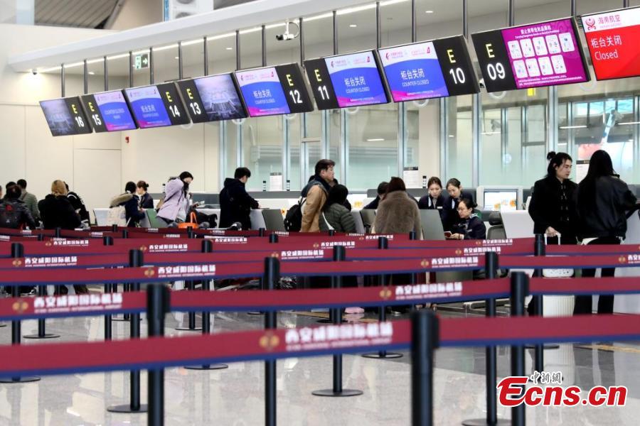 People check in at Terminal 5 of Xianyang International Airport in Xi'an, northwest China's Shaanxi Province, Feb. 20, 2025. (Photo: China News Service/Zhang Yuan)