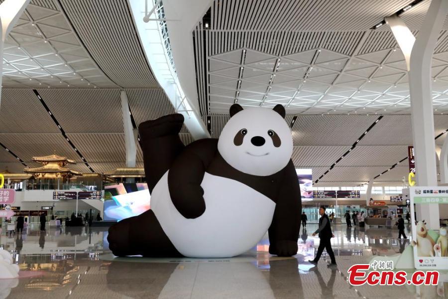 A sculpture of giant panda "Qizai"is displayed at the departure hall of Terminal 5 of Xianyang International Airport in Xi'an, northwest China's Shaanxi Province, Feb. 20, 2025. (Photo: China News Service/Zhang Yuan)