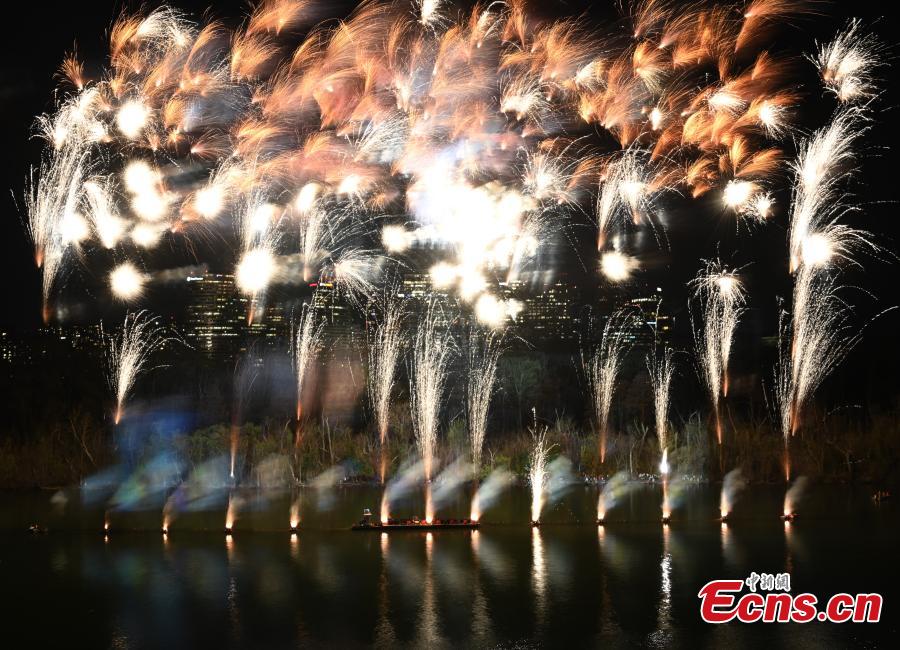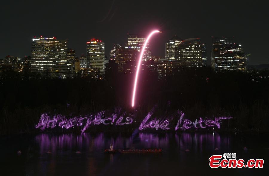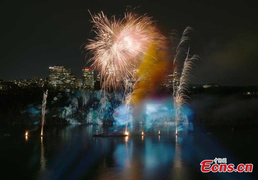 The sky over the Potomac River is illuminated by fireworks created by international contemporary artist Cai Guo-Qiang in Washington D.C, U.S., March 29, 2025. (Photo: China News Service/Chen Mengtong)