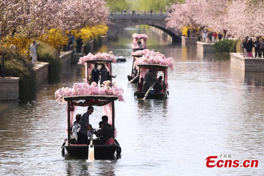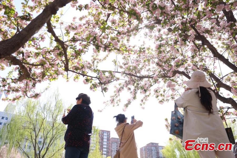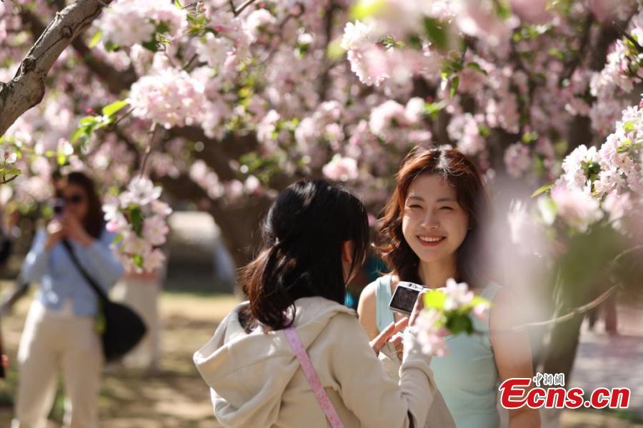 Tourists enjoy blooming crabapple trees at Yuan Dynasty City Wall Relics Park in Beijing, April 2, 2025. (Photo: China News Service/Jiang Qiming)