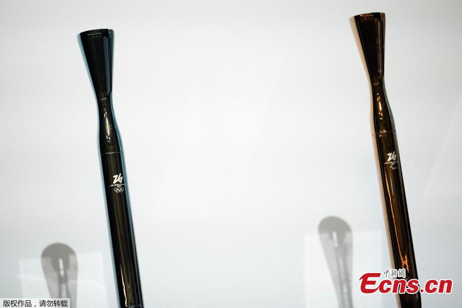 A picture shows the torches for the Milano Cortina 2026 winter olympic (L) and paralympic (R) games during the unveiling ceremony in Milan, Italy, April 14, 2025. (Photo/Agencies)