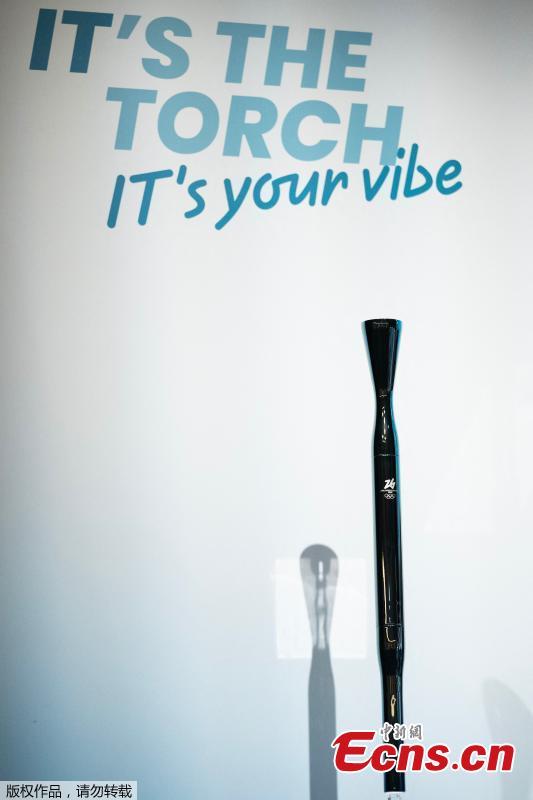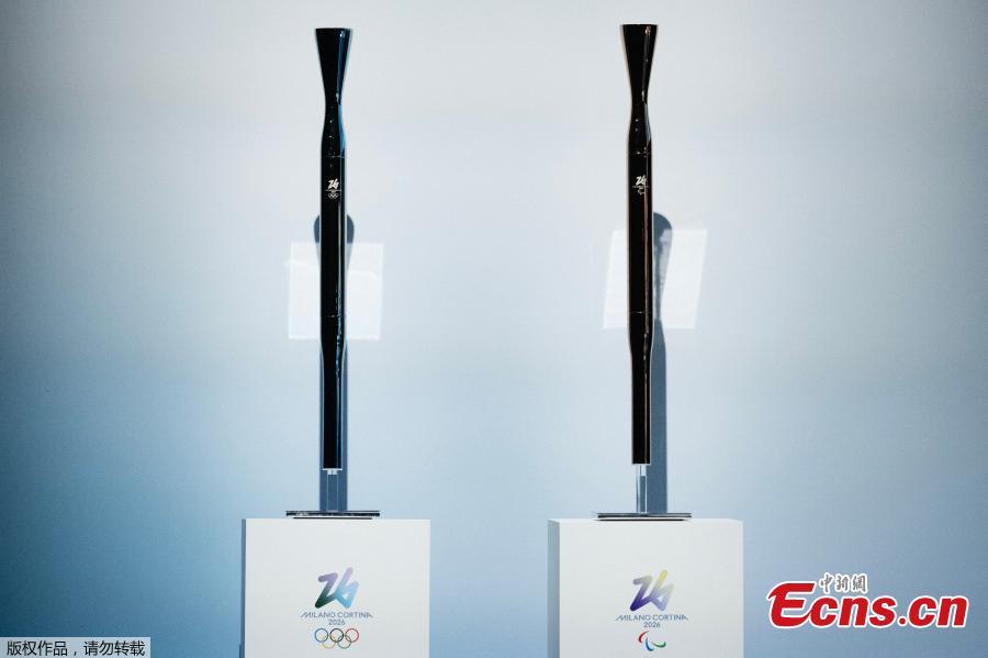 A picture shows the olympic torch for the Milano Cortina 2026 winter olympic and paralympic games during the unveiling ceremony in Milan, Italy, April 14, 2025. (Photo/Agencies)