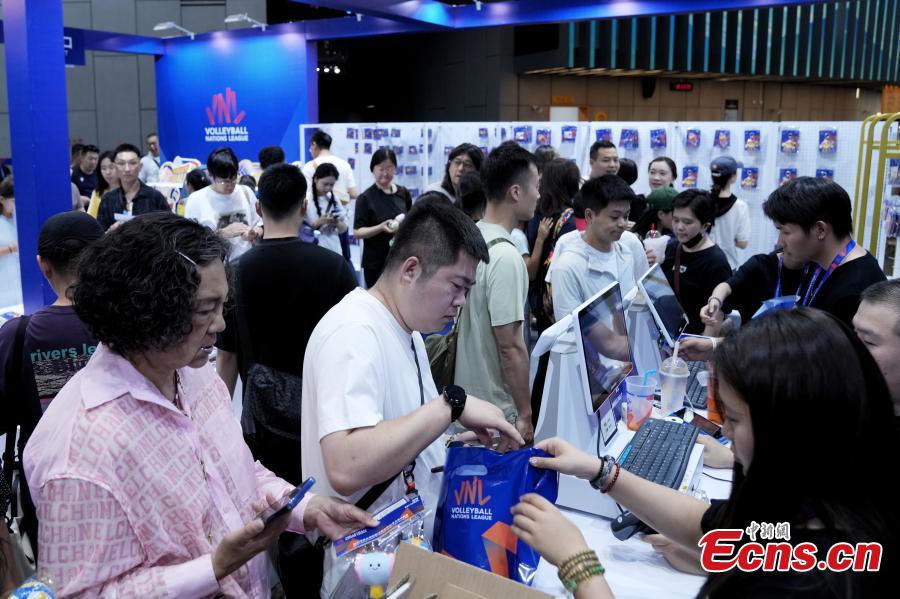 Consumers learn about volleyball-related products at the official merchandise store of the FIVB Volleyball Nations League (VNL) at the National Indoor Stadium in Beijing, China, June 8, 2025. (Photo: China News Service/Zhang Xiangyi)