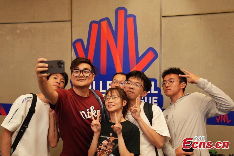 Volleyball fans pose for a photo at the National Indoor Stadium in Beijing, China, June 8, 2025. (Photo: China News Service/Zhang Xiangyi)
