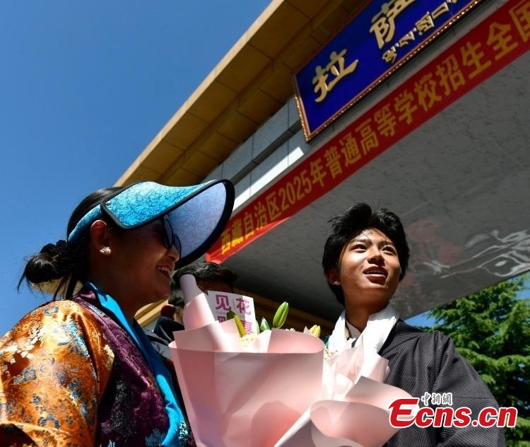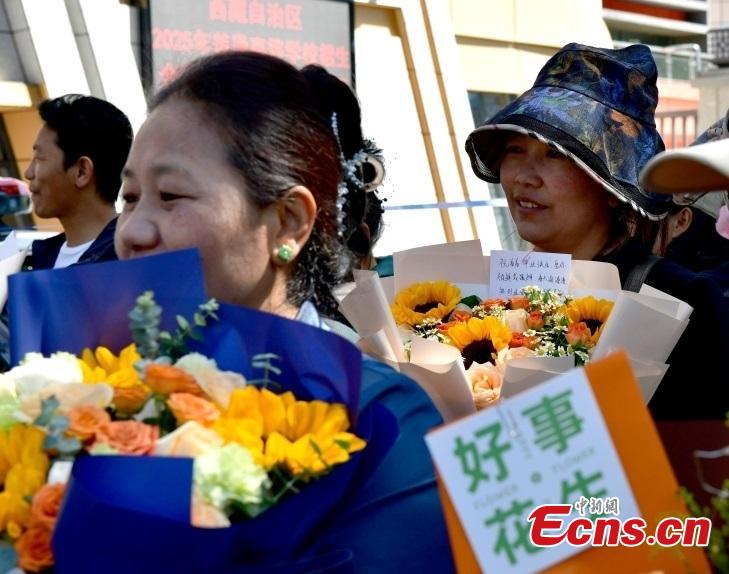 A parent presents fresh flowers to a candidate outside the exam site of Lhasa Middle School in China's Xizang Autonomous Region on June 9, 2025. (Photo: China News Service/Li Lin)