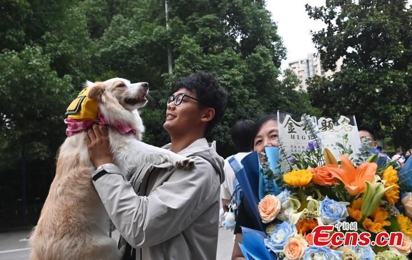 A candidate holds up his pet dog at the exam site of Hefei No. 8 High School in Anhui Province on June 9, 2025. (Photo: China News Service/Han Suyuan)