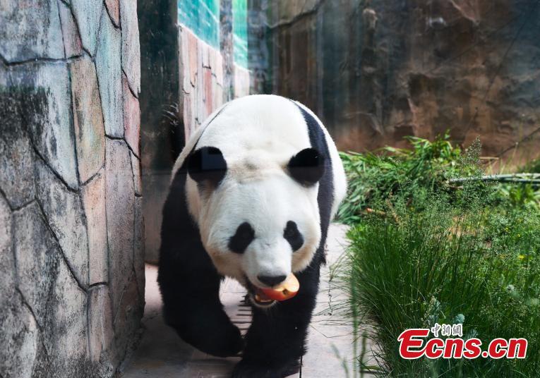 Photo taken on June 10, 2025, shows giant panda Hexing eats bamboo at the Xining Panda House in northwest China's Qinghai Province, enjoying the uniquely cool summer of the plateau. (Photo: China News Service/Xue Di)