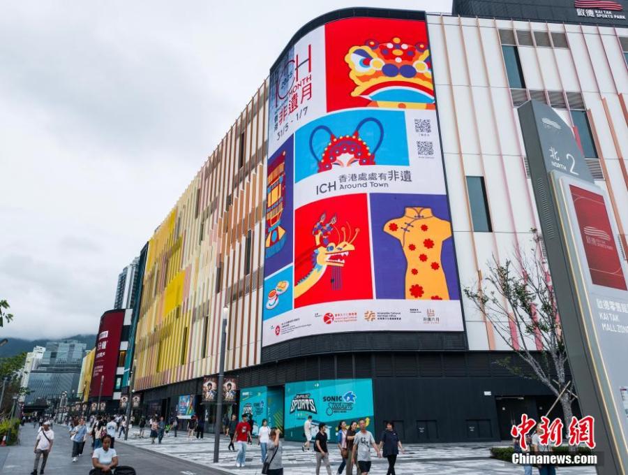 Photo shows a giant promotional display on the exterior wall of Kai Tak Sports Park, a new landmark in the Hong Kong Special Administrative Region (HKSAR), during the Intangible Cultural Heritage Month (ICH Month) event in June 2025. (Photo: China News Service/Hou Yu)